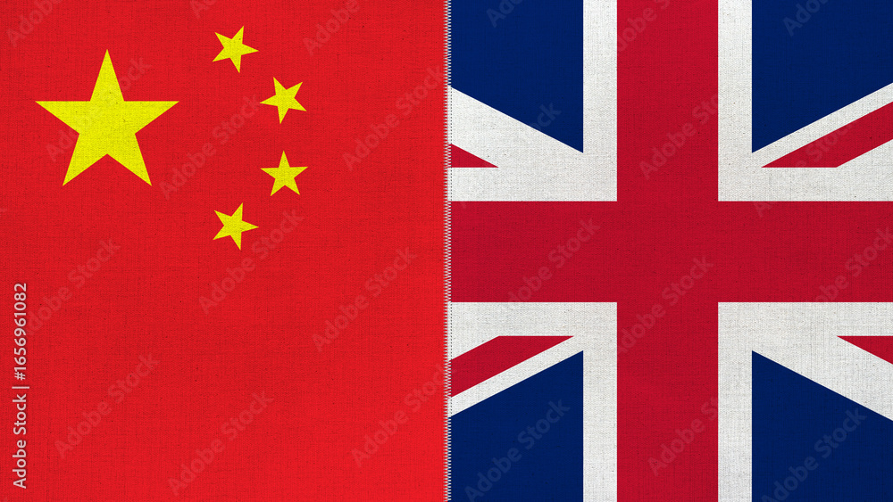 The diagonal and stitched-aligned combined China and United Kingdom UK flags. Concept of Strategic negotiation, national relationship, Conflict, and War.