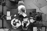 Group of middle aged and senior multiethnic doctors and one middle aged Caucasian man sitting around table discussing medical documents and using laptop during meeting, top view