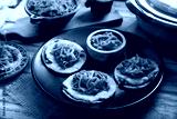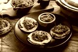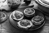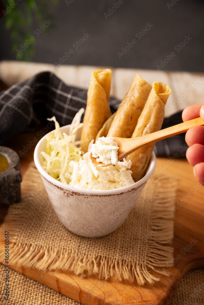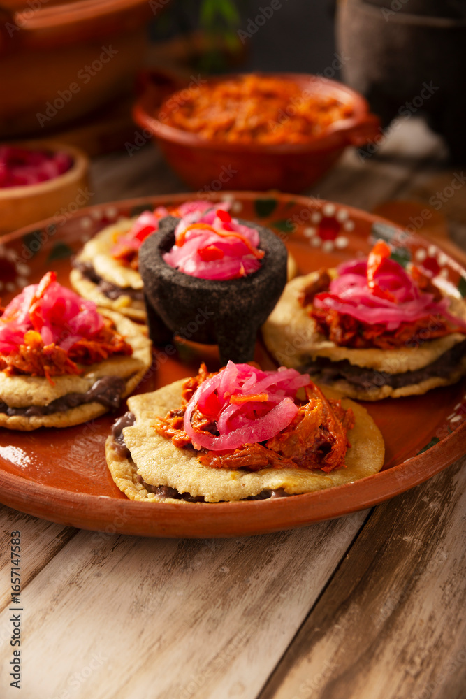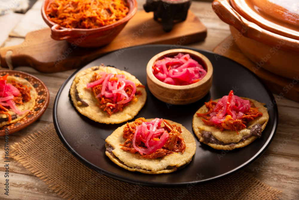 Panuchos, a typical dish from Yucatan, Mexico. A handmade, fried corn tortilla filled with beans, topped with cochinita pibil, pickled red onion, and habanero pepper.
