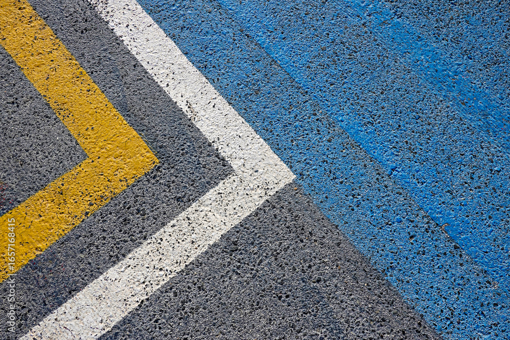 Close-up of textured asphalt road with painted lines in yellow, white, and blue. Urban street environment details. Top view
