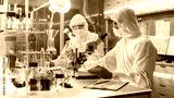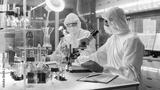 In a Secure High Level Laboratory Scientists in a Coverall Conducting a Research. Chemist Adjusts Samples in a Petri Dish with Pincers.
