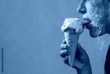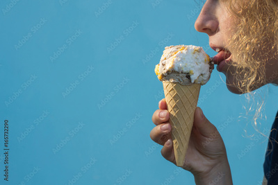 Girl eat big ice cream cones on azure background