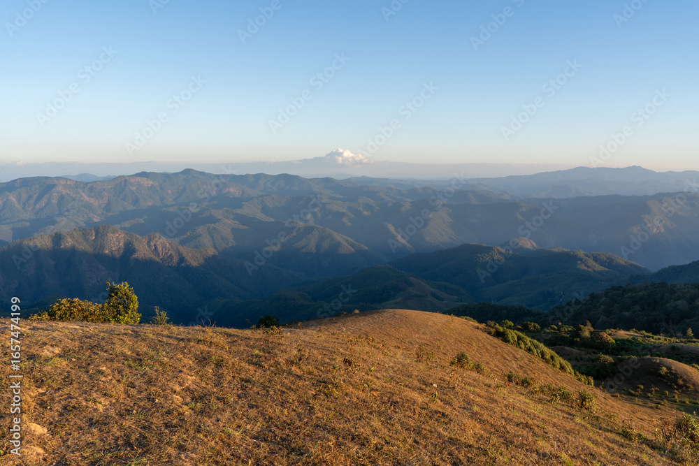 Lush hills and mountain ridges define the picturesque landscape of Mae Hong Son,Thailand. This image captures the serene beauty of the province, with verdant, rolling terrain stretching under open sky