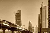 Metro on bridge with highrise buildings in background, Dubai metro in downtown