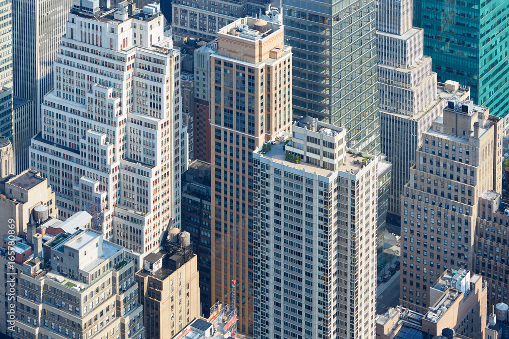 New York City Manhattan skyline aerial view with light colors skyscrapers in sunlight