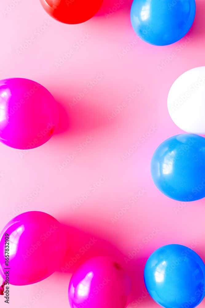 Decorative frame with colorful balloons on pink background top-down frame copy space