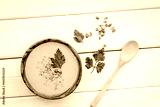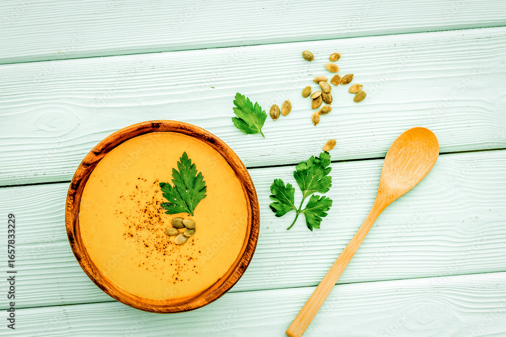 Pumpkin cream soup on green wooden background top-down. Healthy vegetarian food