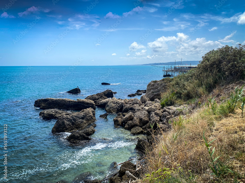 Traditional wooden fishing platform standing on rocky coastline, Adriatic Sea stretching beyond Rocca San Giovanni's scenic Abruzzo landscape