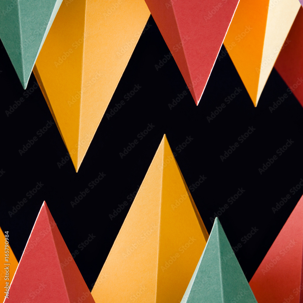Colorful abstract geometric shapes on black background. Three-dimensional pyramid triangular. Yellow blue pink malachite colored objects. shallow depth field.