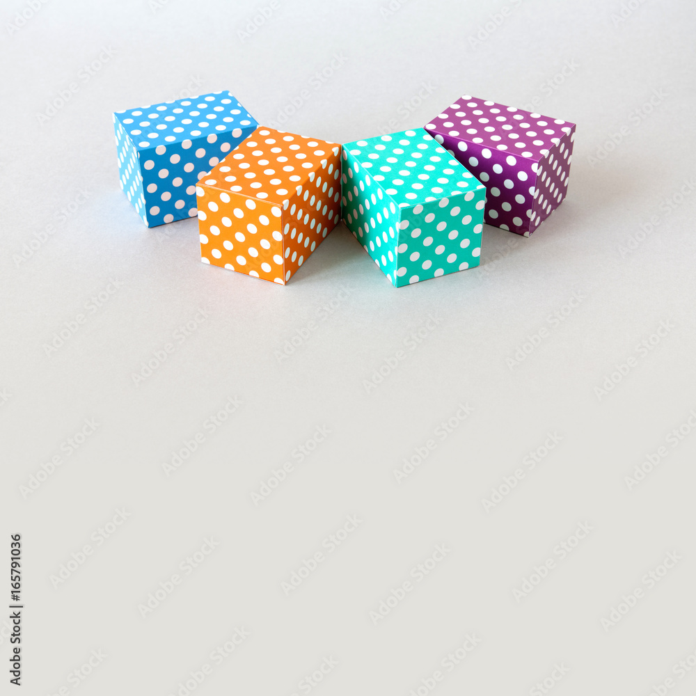 Colorful blocks polka dot pattern. Violet green orange blue color rectangular abstract boxes arranged on gray background. geometrical design concept
