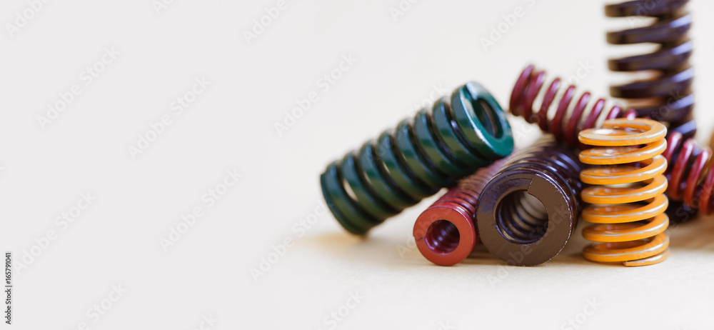 Colorful steel spirals, pressure springs set with different hardness flexibility and size. metallic coil wire objects on gray background. Macro view, shallow depth field. Copy space