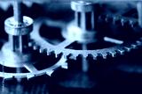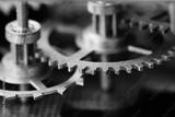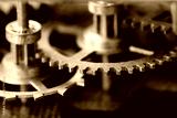 Industrial machinery bronze cog transmission macro view. Aged metal gear wheel teeth mechanism, shallow depth field selective focus.