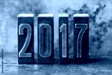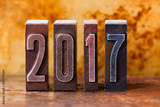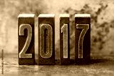 2017 year postcard. Old letterpress digits on rusty metal background. Retro style design xmas poster. Shallow depth field.