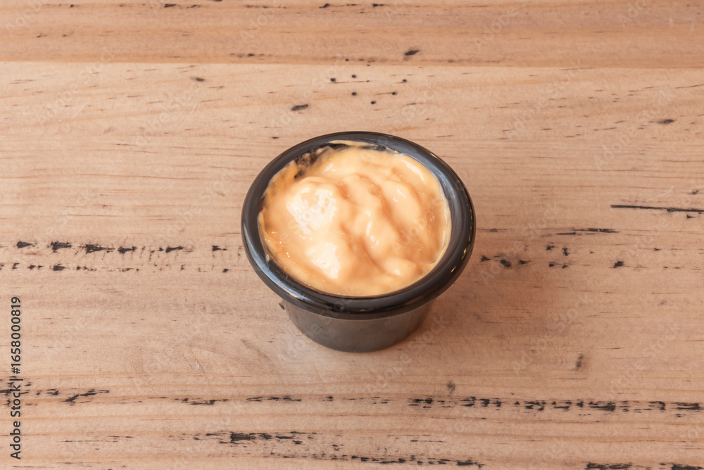 Small shot with spicy chipotle mayonnaise, where the dark orange hue stands out against the white background of the plate