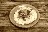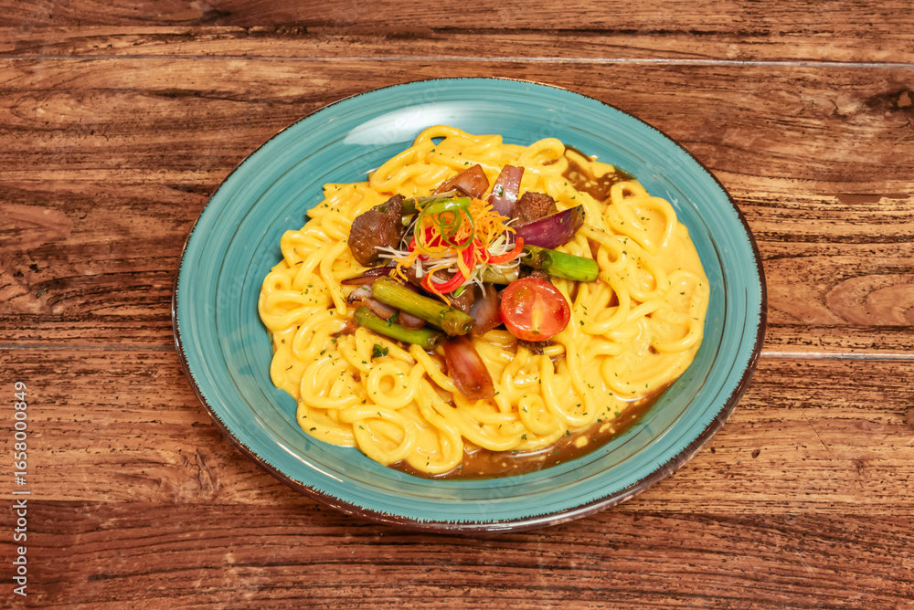 Classic Peruvian sautéed noodles showcasing the perfect balance of al dente noodles, juicy meat, and fresh vegetables, with Scrambled egg strands
