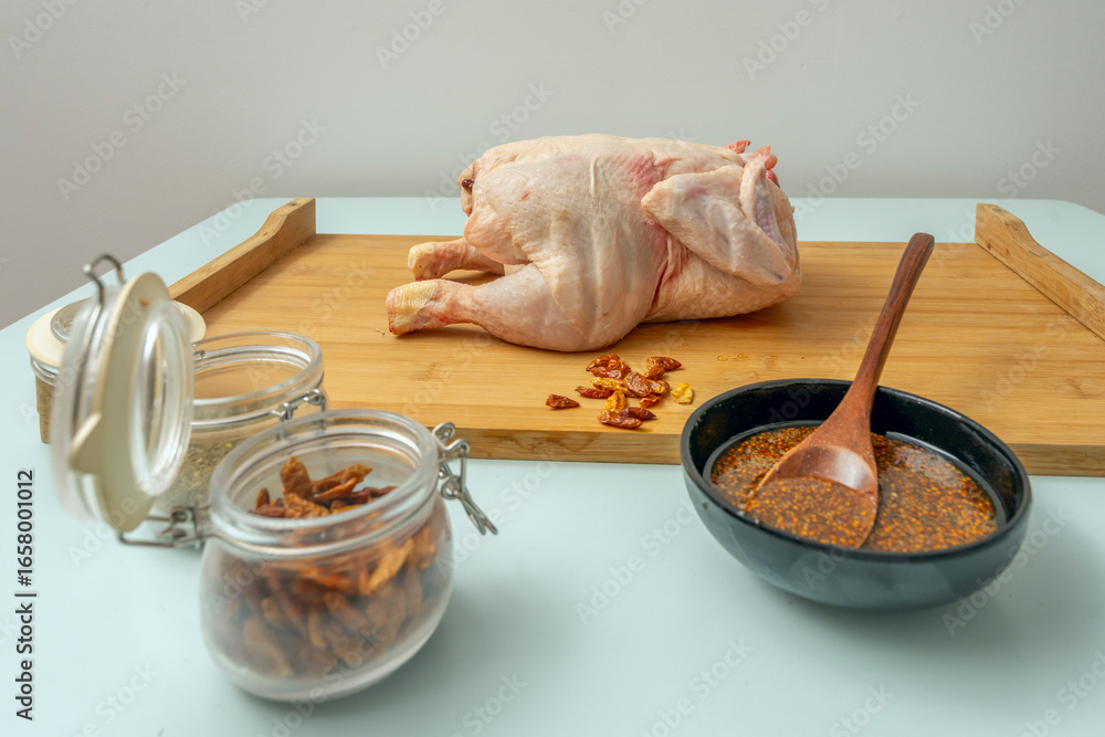 Raw chicken wings in a soy sauce and ginger marinade, layered for air frying