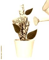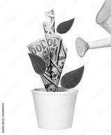 Watering green dollar tree growing in white pot isolated on white.
