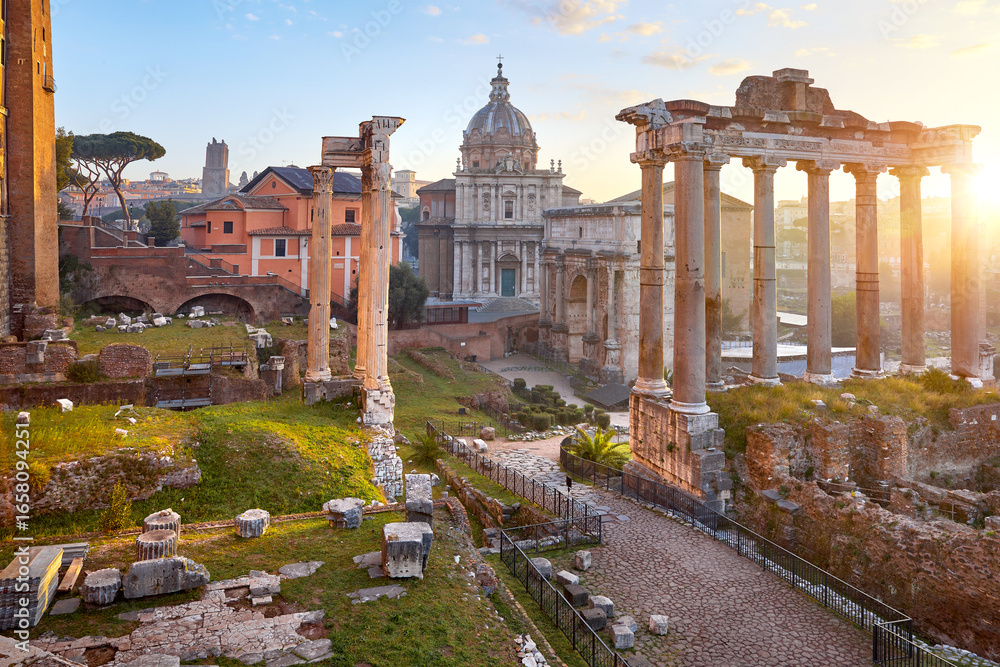 Roman Forum in Rome, Italy. Antique structures with columns. Wrecks of ancient italian roman town. Sunrise above famous architectural landmark Europe.