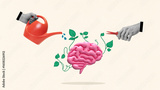 Surreal collage. Brain with green vines watered and trimmed by hands symbolizing mental growth and care. Concept of education, self-development, psychological balance and wellbeing.