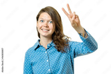 Cheerful lovely girl showing victory sign