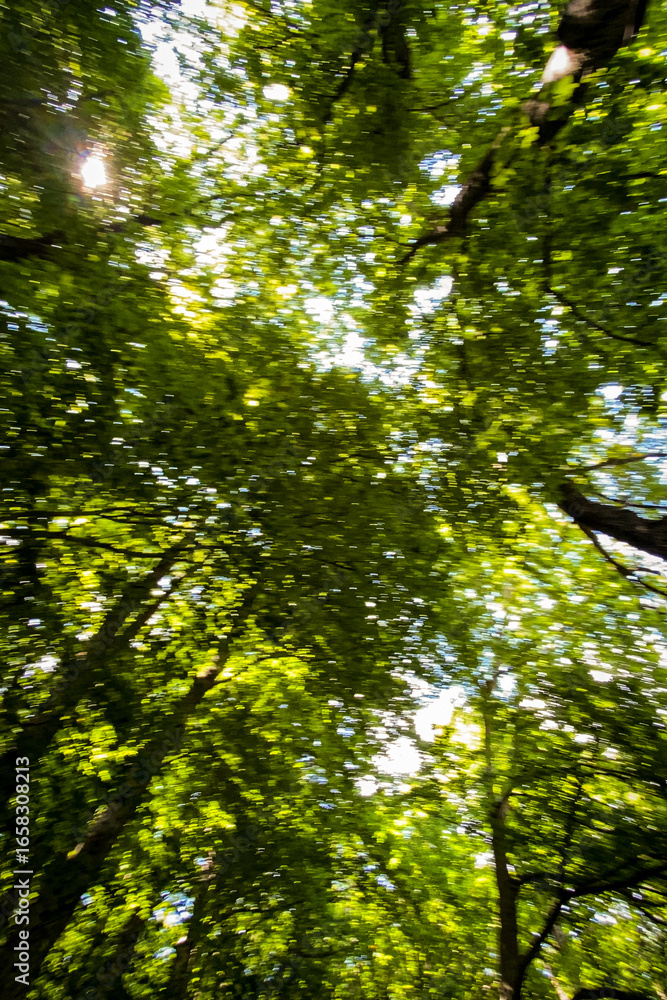Verdant forest canopy filtering golden sunlight, soft motion blur emphasizing lush greenery and natural luminosity