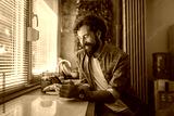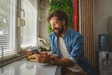 Smiling freelancer enjoying breakfast and checking smart phone in modern office kitchen