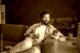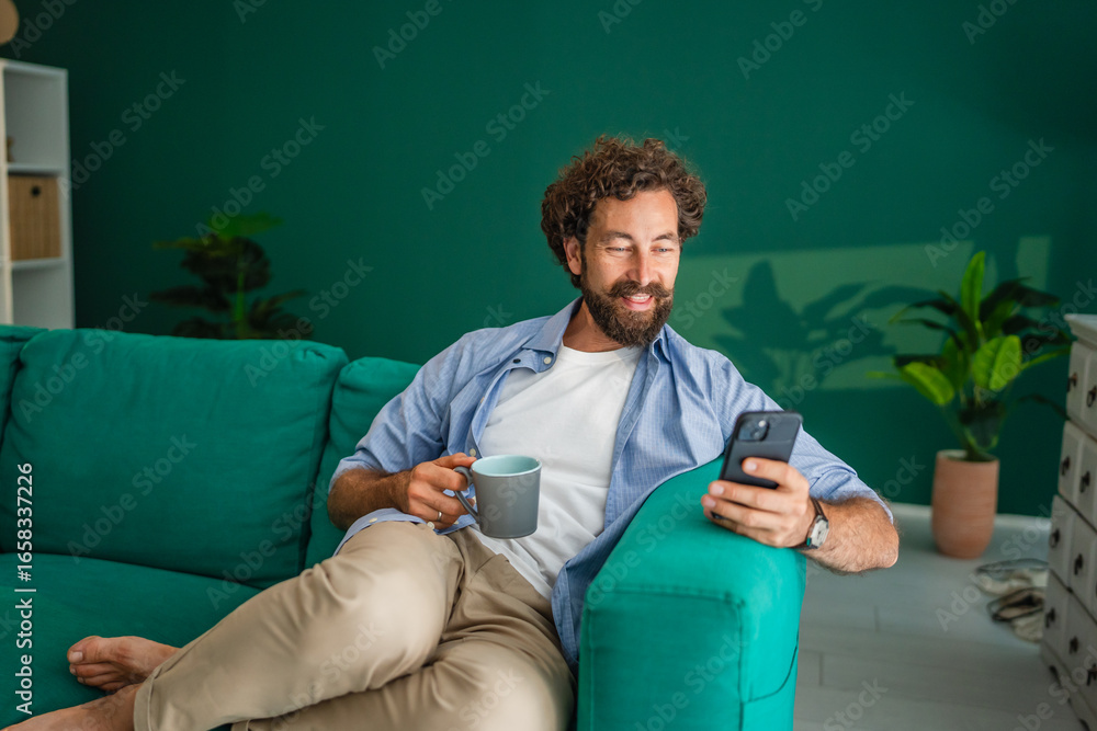 Man relaxing on sofa, enjoying coffee and browsing smart phone at home