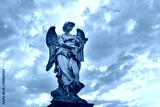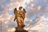 Marble statue of Angel with the Whips at sunset, one of the ten angels on Saint Angel Bridge, symbols of Christ's Passion, Rome, Italy