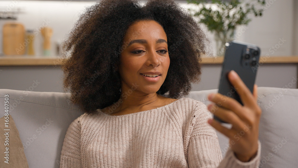 African American ethnicity woman talking video call holding mobile phone relaxing on couch at home living room girl female communicate with smartphone chatting distant conversation conference speak