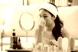 Beautiful young asian woman smile with skin care use oil blotting paper on face looking mirror in the room, beauty woman happy and clean makeup and cosmetic with tissue, skincare and health