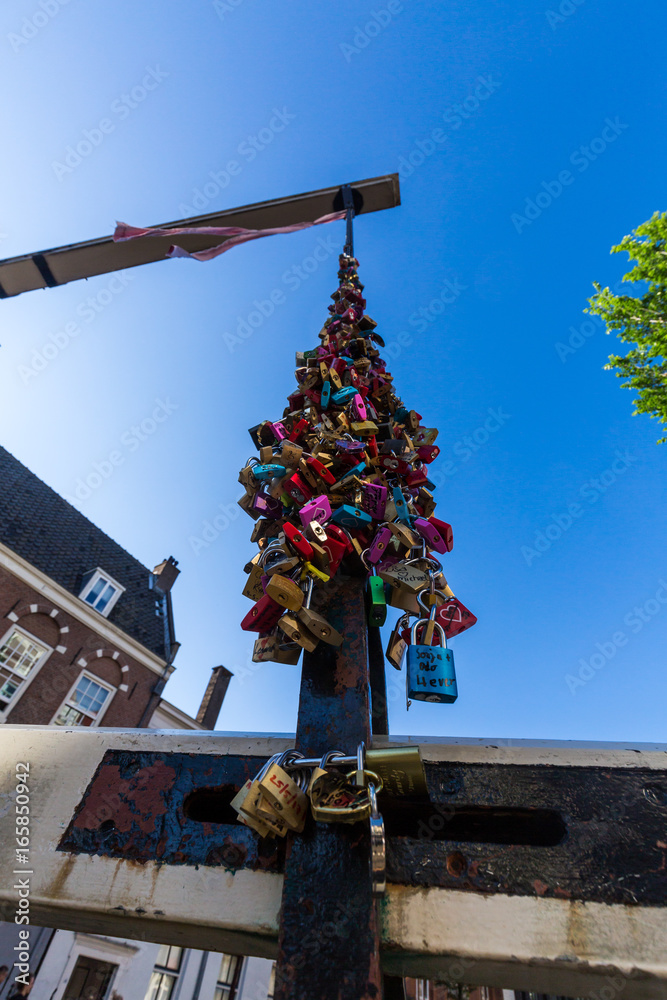 View of locks at the Love Lock Bridge in the old town part of Amsterdam