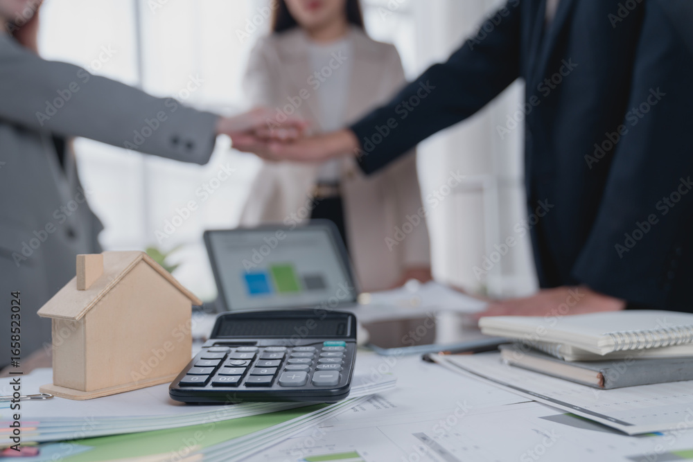 Real estate agents joining hands in celebration after closing a deal, surrounded by a house model, calculator, and important documents on a desk in the office