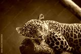 Close-up of a Sri Lankan leopard (Panthera pardus kotiya) resting on a tree trunk. Endangered big cat wildlife photography, ideal for nature, safari, and conservation themes.
