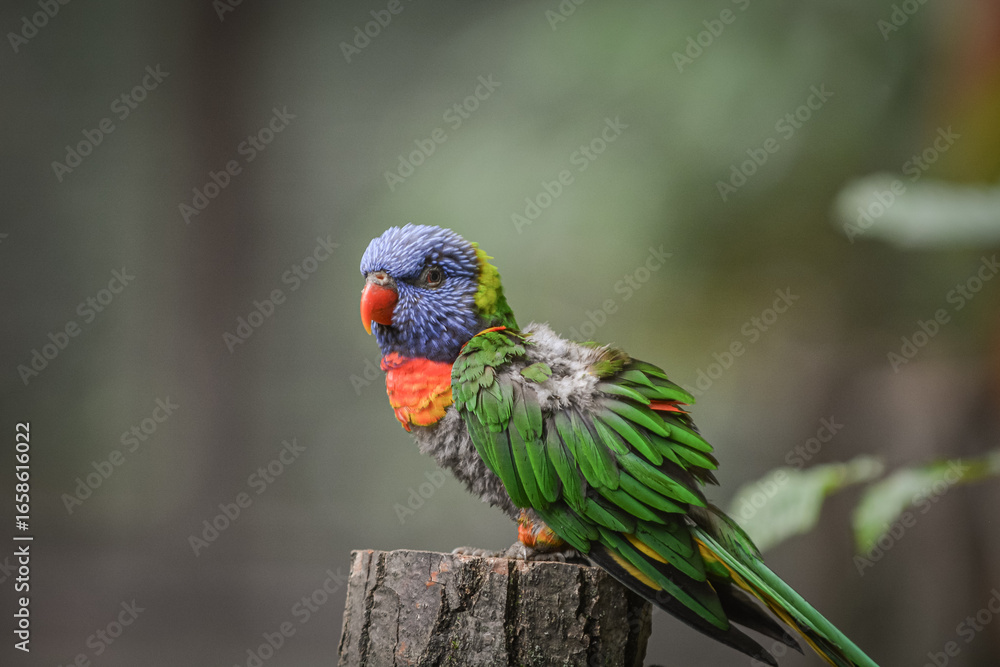 Juvenile rainbow lorikeet (Trichoglossus moluccanus) with partially developed plumage and visible down feathers. Colorful parrot perched in natural environment, wildlife photography of exotic bird