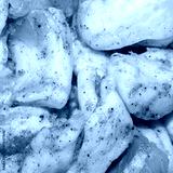 Salted bacon with pepper and garlic.Lard marinated with spices and garlic.Homemade bacon slices.Fat background.