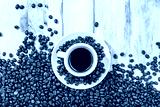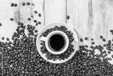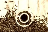 Cup of Espresso Coffee and roasted beans on wooden table background