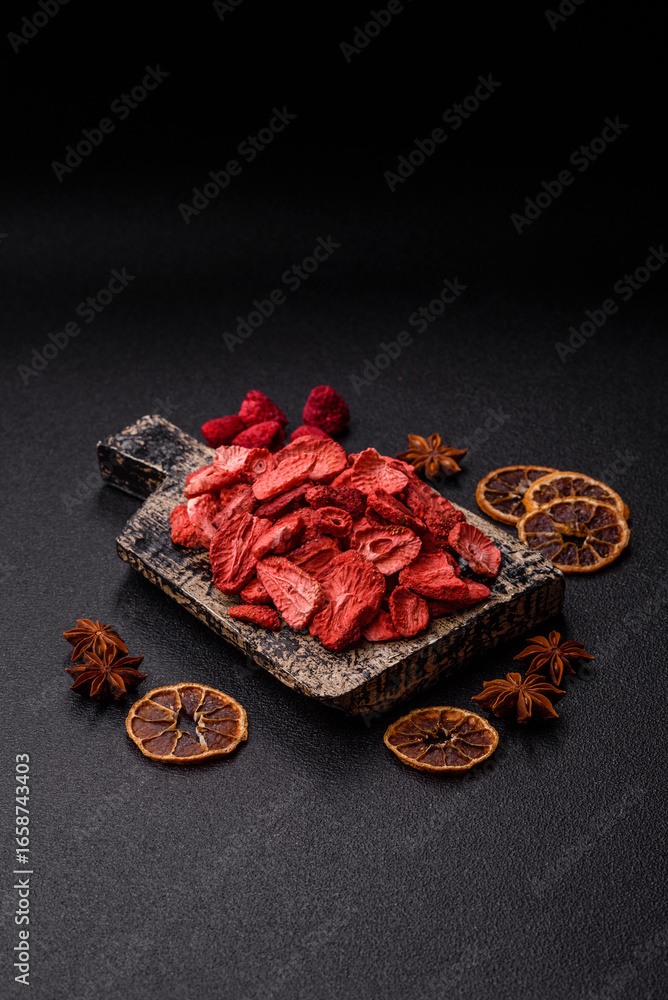 Dried sublimated slices of strawberry as an ingredient for sweet desserts. Dried strawberry
