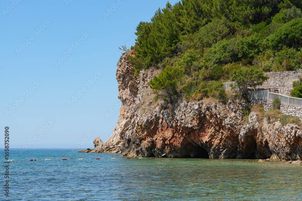 Rocky seaside cliff with green trees by the clear Adriatic coast