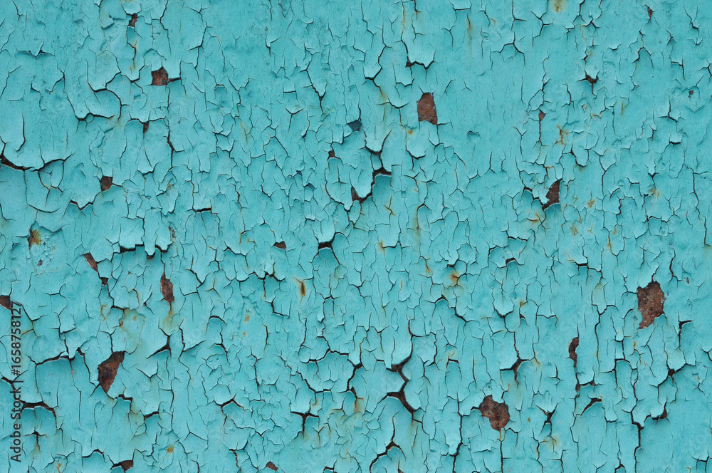 Peeling blue paint on metal surface. Abstract background and texture for design.