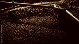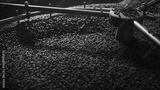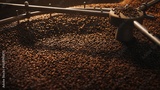 Freshly roasted coffee beans cooling in large circular tray under rotating metal arms. Evenly spreading beans for uniform temperature. Releasing rich aroma before storage and packaging.