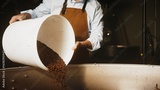 Male wearing light blue shirt and brown apron tilting large white bucket. Pouring roasted coffee beans into metal roaster. Preparing for next roasting stage and ensuring even distribution of beans.