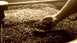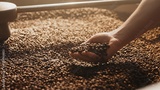 Hand gently releasing roasted coffee beans over large pile under warm light. Assessing roast level and texture while working in cooling tray during final stage of coffee preparation.