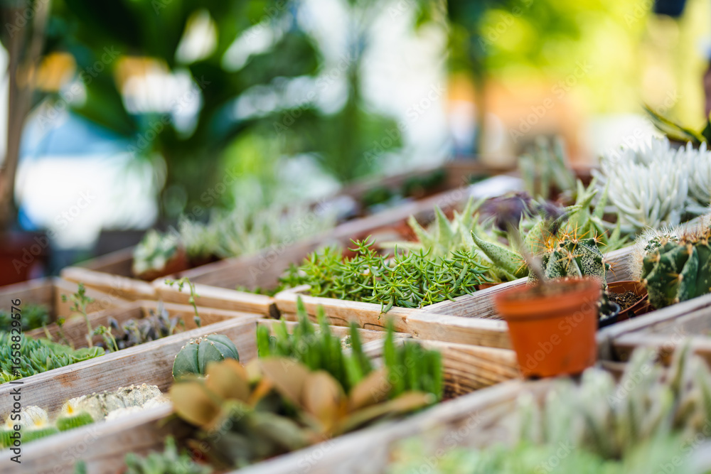 Vibrant collection of small potted succulents and cacti is displayed in a greenhouse or garden center.