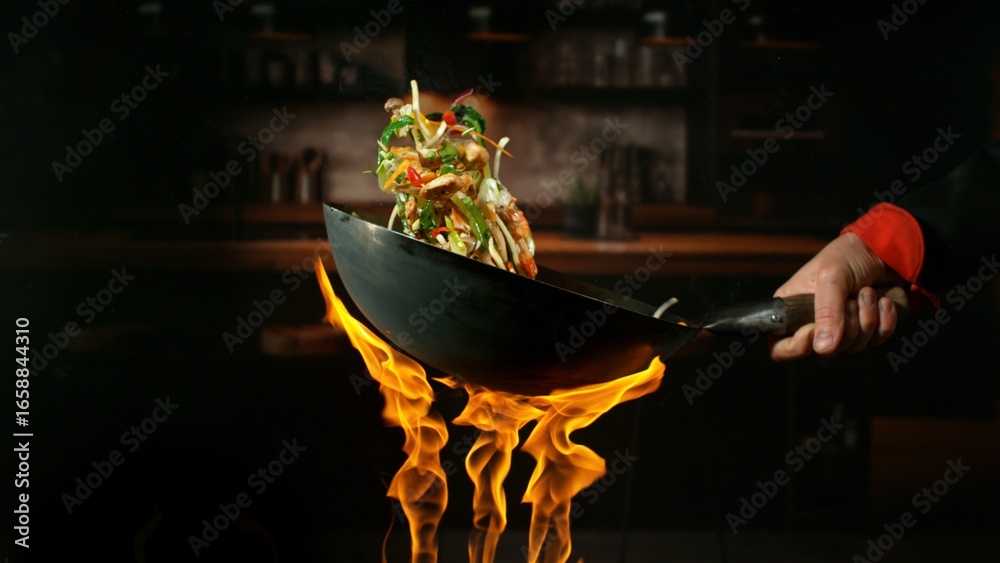 Freeze Motion of Flying Asian Wok Ingredients with Fire Flames
