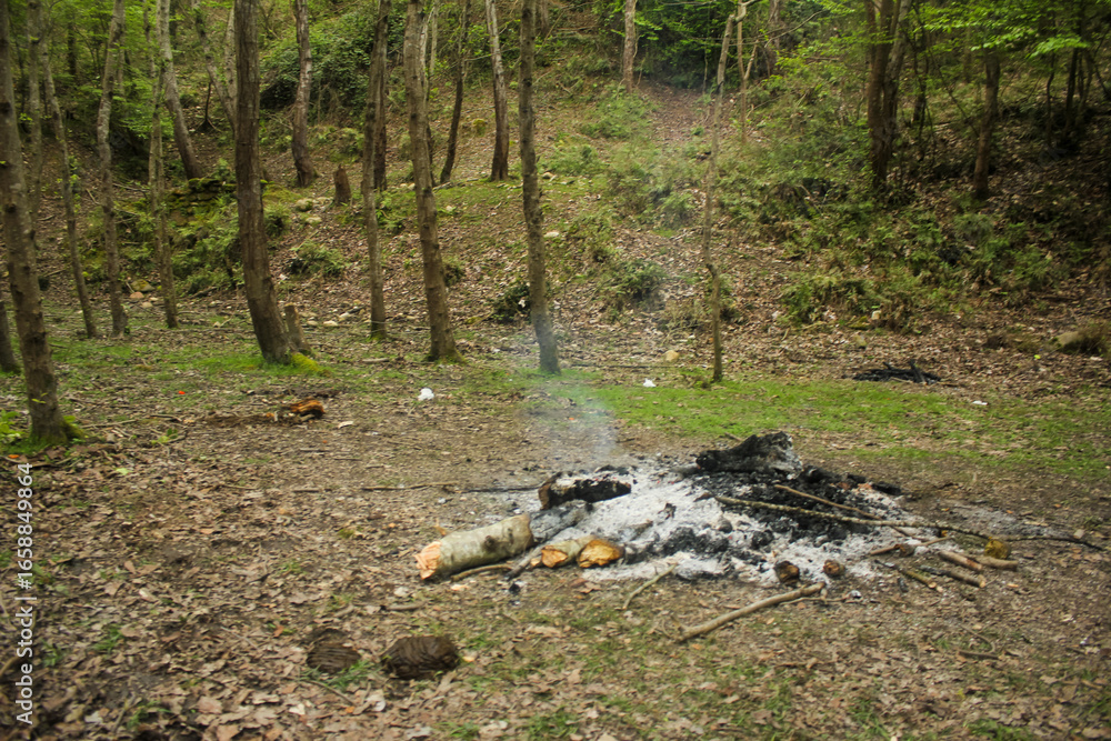 Scenic forest campfire in Mazandaran with smoldering logs, surrounded by lush greenery. Perfect for outdoor adventure and nature stock photos.