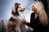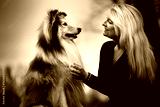 Woman and Sheltie side profile, eye contact, blue hour