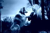 Sheltie paw on woman’s shoulder, sitting on log, blue hour