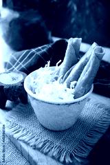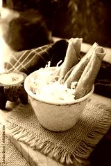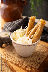 Flautas Ahogadas (Drowned Flautas) Golden tacos made with fried corn tortillas, filled with chicken or beef, and served in a glass or cup containing salsa or broth, lettuce, sour cream, and cheese.