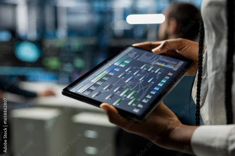 Close up of data center developer running simulations on tablet for AI forecasting, tracking performance. Server hub IT expert using device, integrating artificial intelligence APIs into software