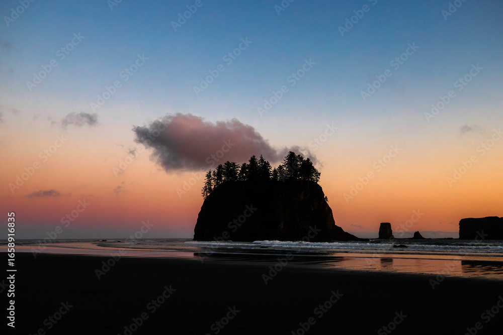 Sunset at Second Beach, Olympic National Park, Washington. Silhouettes of sea stacks and gentle ocean waves under a glowing sky.